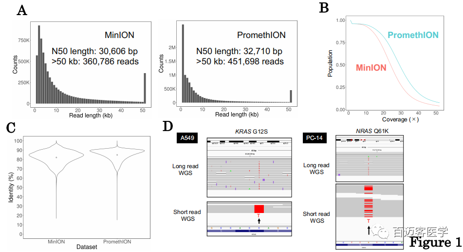 PromethION vs MinION:為了探究PromethION測序是否與MinION測序兼容,比較了獲得的兩個數(shù)據(jù)集的特征。Reads長度的總體分布是相似的(圖1A)。這兩個數(shù)據(jù)集都包含很大一部分超過50 kb的長讀長reads(MinION:360,786個讀,PromethION:451,698個),20X以上測序深度覆蓋了超過50%的人類基因組區(qū)域(圖1B),兩個數(shù)據(jù)集均顯示了超過80%的整體保真度(圖1C),與先前的研究相似。PromethION平臺各項指標稍微好一點。結論:PromethION是用于整個癌癥基因組測序的有效分析方法。