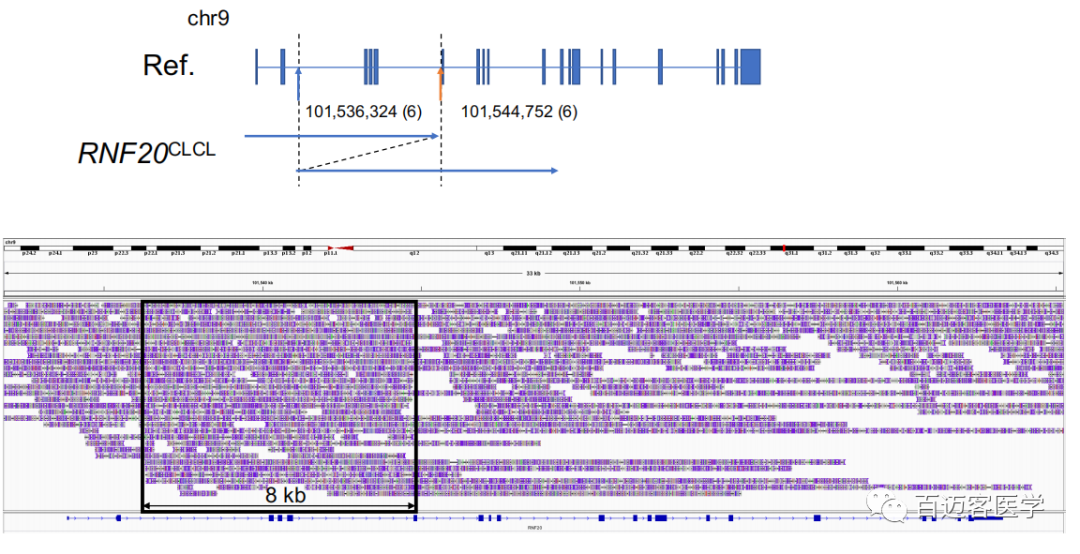 再次成功檢測到CLCL,9個樣本中有6個在其腫瘤基因組中至少包含一個CLCL,包括幾個關鍵的癌癥基因。例如,在病例S8中,確定了RNF20 CLCL。該患者為女性患者,已被證明具有EGFR外顯子19缺失作為驅動突變。但是,其他癌癥突變仍然難以捉摸。RNF20基因的CLCL為內含子2(chr9:101,536,324)和內含子6(chr9:101,544,752)之間的串聯(lián)重復,這很可能導致該基因的功能喪失。RNF20基因編碼具有抑癌功能的E3泛素連接酶,并且經(jīng)常發(fā)生突變,特別是在肺癌中。表3總結了獲得患者致癌作用的分子病因學指征。需要進一步擴展長讀長測序序列,以更√確地識別CLCL的頻率和CLCL偏好的基因。