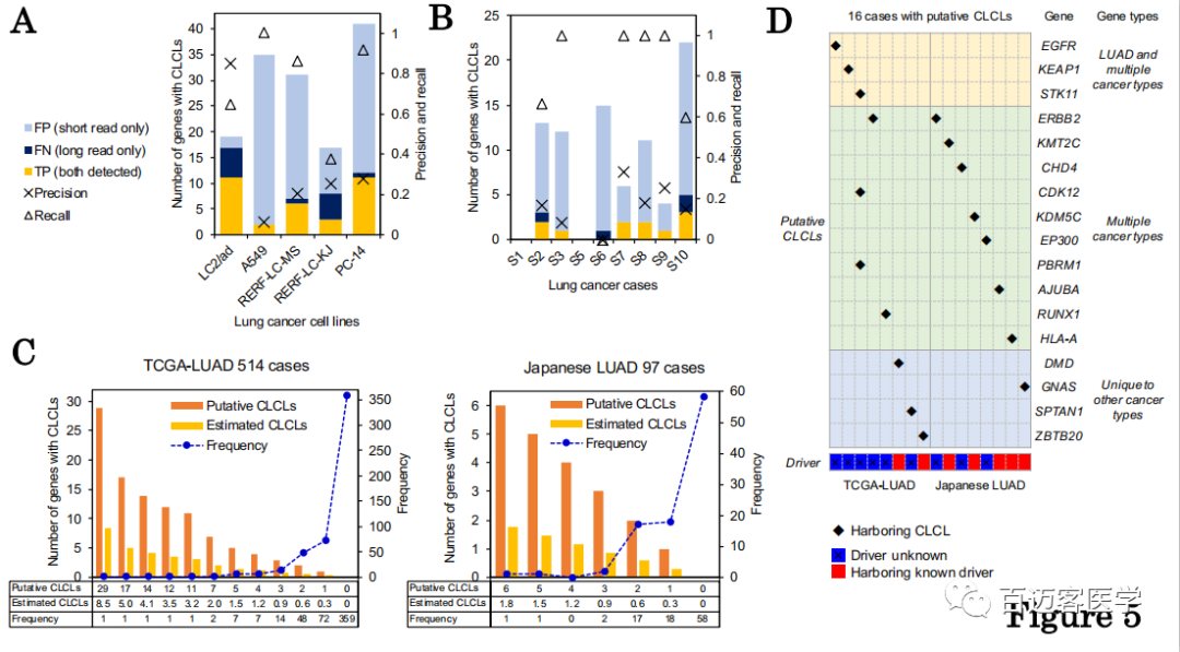 盡管對于所有細胞系和臨床樣品,使用短讀長數(shù)據(jù)分別估計21%和72%的CLCL檢測z確度和重復檢出率,但將構建的分析流程應用于514個 TCGA肺腺癌(TCGA-LUAD)和97個日本肺腺癌(Japanese LUAD)樣本全外顯子組測序數(shù)據(jù),通過分別從TCGA-LUAD和日本LUAD病例中進行軟切割reads分析,共檢測到269個和50個具有串聯(lián)重復結構的連接點,這些結構可能對應于CLCL(每個病例1至29個基因)。總計從155(30%)TCGA-LUAD和39(40%)日本LUAD病例中提取了候選CLCL(圖5C)。