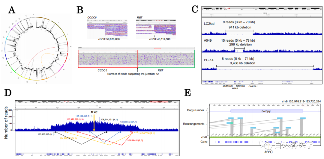 使用長讀長測序數(shù)據(jù),嘗試檢測比點突變大的結構畸變(圖2A)。從LC2/ad的MinION/PromethION數(shù)據(jù)集中,成功鑒定出12條reads與CCDC6-RET融合基因的junction位點直接重疊,這是該細胞系已知的“癌癥驅動突變”(圖2B)。進一步嘗試鑒定大的缺失,前人報道抑癌基因CDKN2A基因周圍有大的缺失,發(fā)生在LC2/ad,A549和PC-14細胞中。使用這項研究中的MinION/PromethION數(shù)據(jù)集,我們再次確認了該基因在各細胞中的缺失(圖2C)。此外,每個CDKN2A缺失的√確連接點在細胞類型之間是不同的。