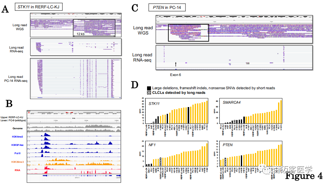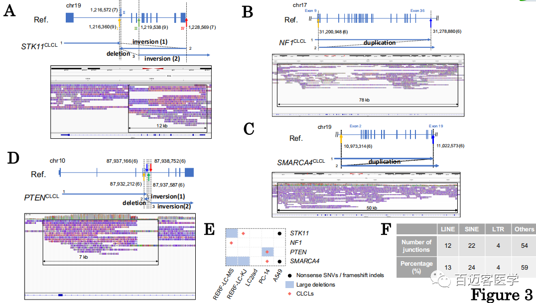 我們對其他CLCL進行了類似的分析,對于PC-14中的PTEN基因(圖4C),CLCL位于外顯子6。結果,該外顯子完全跳躍。因此,所得的轉錄本應移碼,可能導致PTEN基因的功能喪失。根據(jù)Illumina RNA-seq數(shù)據(jù)檢查了包含CLCL的STK11,NF1,SMARCA4和PTEN基因中的RNA表達水平。結果表明,CLCL通??赡軐е禄虮磉_水平降低(圖4D)。但是,在某些情況下,基因表達水平仍然很顯著,例如RERF-LC-MS細胞中的NF1轉錄本和PC-14細胞中的PTEN轉錄本。