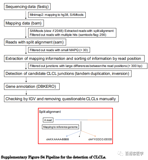 為了更普遍地識別所有肺癌細胞系其他基因座中的CLCL,作者構建了一條新的分析性生物信息學流程。簡而言之,利用了來自比對結果的split比對信息,根據(jù)reads位置對比對信息進行排序,并提取了候選CLCL。相關的reads被重組以重建其結構。