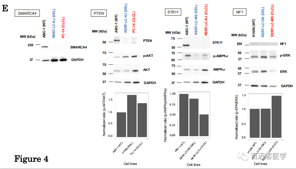 為了解決CLCL的生物學意義,作者研究了受CLCL影響的基因座如何引起蛋白質表達水平及其相關信號通路變化。蛋白質印跡WB分析發(fā)現(xiàn)STK11,NF1,SMARCA4和PTEN的蛋白質在這些基因中帶有CLCL的細胞中完全丟失了(圖4E)。進一步檢查了下游蛋白的激活狀態(tài),在所有檢查的case中均觀察到了預期的信號通路破壞。磷酸化的AKT(phospho-AKT)相應地激活mTOR信號通路,而PTEN抑制AKT的磷酸化。觀察到phospho-AKT異常上調,反映了PC-14細胞(PTEN-CLCL)中PTEN的功能喪失。AMPK是在維持細胞動態(tài)平衡中起重要作用的基因,AMPK蛋白在其α亞基處的磷酸化被STK11激活。在RERF-LC-KJ細胞(STK11-CLCL)中,其激活受到損害。NF1基因是RAS的負調控因子,位于RAS信號通路下游的磷酸化ERK在RERF-LC-MS細胞(NF1-CLCL)中異常上調。無論是由于常規(guī)畸變還是CLCL,相應基因的蛋白質明顯丟失,但其后果仍會根據(jù)情況而有所不同。例如,即使STK11蛋白在RERF-LC-MS細胞(STK11缺失)和RERF-LC-KJ細胞(STK11-CLCL)中類似地消失,在RERF-LC-KJ細胞(STK11-CLCL)中磷酸-AMPKα的增強比例也更高。RERF-LC-OK(NF1-缺失)細胞系中NF1蛋白影響幾乎無法檢測到,而對RERF-LC-MS細胞(NF1-CLCL)的影響卻很明顯。表明,其他途徑有時可以彌補關鍵蛋白的缺失。