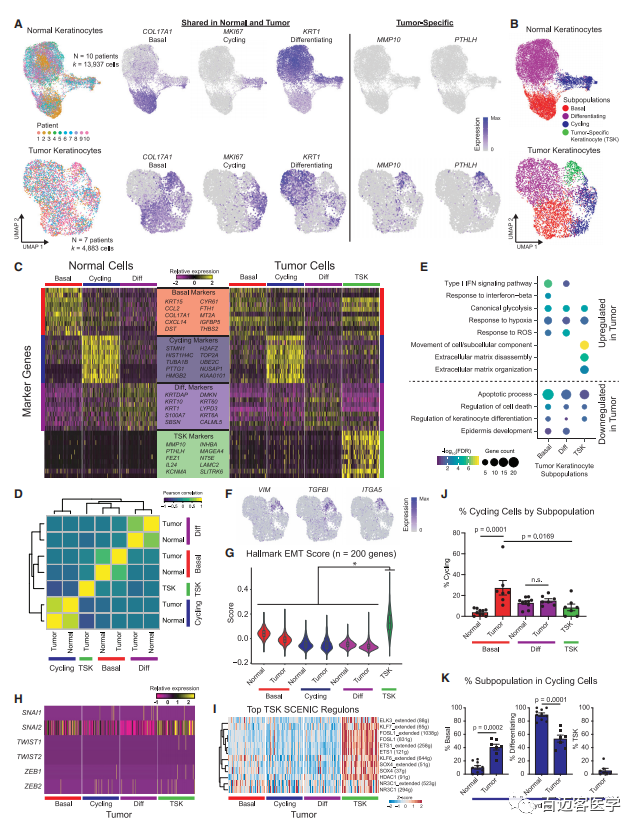重新聚類正常上皮細(xì)胞后,在正常皮膚中觀察到3個主要的角質(zhì)細(xì)胞(KC)亞群(基底、循環(huán)、分化細(xì)胞)。典型相關(guān)分析表明腫瘤KCs廣泛重現(xiàn)了正常(基底、循環(huán)、分化細(xì)胞)亞群,在正常皮膚和cSCC中有幾個共享的標(biāo)記基因(圖2A-D)。有趣的是,在腫瘤細(xì)胞聚類中出現(xiàn)了與正常皮膚無明顯關(guān)聯(lián)的第四個KC亞群,即TSK亞群(圖2B-D)。事實上,在這一簇與其他腫瘤細(xì)胞區(qū)別開來的100個基因中,有99個基因在腫瘤組織中的表達(dá)明顯高于正常組織。TSK標(biāo)記基因與細(xì)胞運動和細(xì)胞外基質(zhì)分解有關(guān),暗示了它的侵入性(圖2E)。TSKs表達(dá)經(jīng)典的上皮-間質(zhì)轉(zhuǎn)化(EMT)標(biāo)志物,如VIM和ITGA5(圖2F);但是EMT類似的TSK細(xì)胞缺乏經(jīng)典表達(dá)EMT轉(zhuǎn)錄因子(圖2H)。因此,我們通過單細(xì)胞調(diào)控網(wǎng)絡(luò)進(jìn)行推理和聚類,提名AP1和ETS家族成員為潛在控制TSKs的TFs(圖2I)。TSK細(xì)胞也表現(xiàn)出較大的EMT評分范圍,提示細(xì)胞狀態(tài)具備高可塑性(圖2G),與EMT連續(xù)模型一致?;准?xì)胞(Basal)在腫瘤中的發(fā)生率約是正常循環(huán)細(xì)胞的四倍(圖2K)。總的來說,cSCC表現(xiàn)出分化失常,基底細(xì)胞迅速增殖,并出現(xiàn)表達(dá)EMT連鎖基因的TSK亞群。