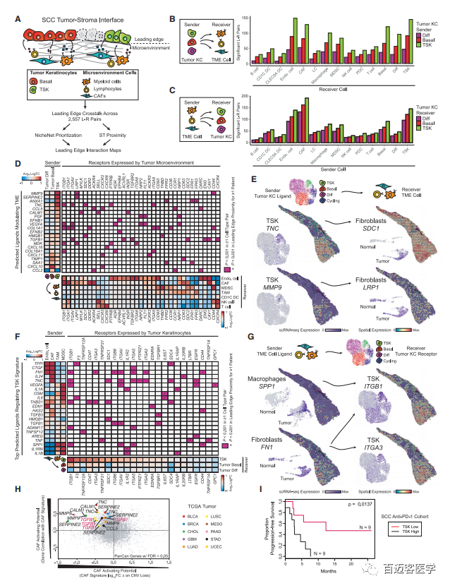 進(jìn)一步,我們整合scRNA-seq和ST數(shù)據(jù)來描述前沿鄰近腫瘤和TME細(xì)胞之間的信號通路(圖6A)。基于配體-受體對數(shù)據(jù)庫,TSKs廣參與了自分泌和旁分泌相互作用(主要與CAFs、內(nèi)皮細(xì)胞、巨噬細(xì)胞和MDSCs)(圖6B&C)。我們使用NicheNet和ST對前沿預(yù)測為調(diào)節(jié)TME特異性細(xì)胞類型標(biāo)記的腫瘤KC配體進(jìn)行優(yōu)先排序。與TSK-纖維血管生態(tài)位一致的是,對CAFs的顯著TSK信號通路是由幾對TSK-CAF配體-受體對介導(dǎo)的,包括MMP9-LRP1和TNC-SDC1(圖6D&E)。此外,TSKs可通過配體-受體對(PGF-FLT1、PGF-NRP2和EFNB1-EPHB4)調(diào)節(jié)內(nèi)皮細(xì)胞。相反地,內(nèi)皮細(xì)胞和CAFs顯著共表達(dá)NicheNet預(yù)測配體,如TFPI, FN1,和THBS1,這些與TSK受體匹配(圖6F&G)。進(jìn)一步證實TSKs是一種類似EMT的群體。為了判定TSK細(xì)胞是否與多變的TME普遍關(guān)聯(lián),我們調(diào)研了TCGA數(shù)據(jù)庫中31種實體瘤數(shù)千個轉(zhuǎn)錄組數(shù)據(jù)。我們進(jìn)一步判定TSK配體是否誘導(dǎo)CAF基因(1)伴隨配體CNV缺失,減少CAF基因表達(dá);(2)配體表達(dá)和CAF基因的關(guān)聯(lián)(圖6H),這個在過往研究中被證實。另外TSK細(xì)胞可以抑制抗腫瘤免疫。雖然這些研究還不明確TSK細(xì)胞是內(nèi)在抵抗還是免疫調(diào)節(jié)活性起作用,但這個亞群提供了一個提高免疫治療的目標(biāo)方向。