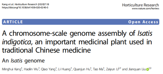 2020年2 月1日,四川大學(xué)生命科學(xué)學(xué)院劉建全課題組與華中農(nóng)業(yè)大學(xué)作物遺傳改良國(guó)家重點(diǎn)實(shí)驗(yàn)室李再云課題組首次完成了菘藍(lán)(Isatis indigotica,2n=14)染色體級(jí)別基因組圖譜繪制。該研究利用Pacbio測(cè)序(140X)結(jié)合北京百邁客生物技術(shù)有限公司的Hi-C技術(shù)(284X)組裝得到294Mb高質(zhì)量基因組(contigN50=1.2Mb)。基于同源搜索和功能注釋,確定了該物種主要化合物(如吲哚類、萜類、黃酮、木脂素等物質(zhì))的可能生物合成通路和相關(guān)的候選基因。該研究強(qiáng)調(diào)了基因組測(cè)序在鑒定藥用植物代謝產(chǎn)物合成候選基因中的重要性,為今后十字花科植物比較基因組等研究提供了重要遺傳信息。