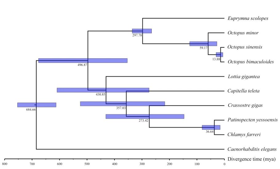 比較基因組學(xué)分析發(fā)現(xiàn)預(yù)測(cè)到的31676個(gè)基因中有24698個(gè)基因可被聚類到17020個(gè)基因家族。其中有741個(gè)基因家族為10個(gè)物種共有,包含有10653個(gè)同源基因。利用10個(gè)物種的238個(gè)單拷貝同源基因構(gòu)建進(jìn)化樹,結(jié)果表明長(zhǎng)蛸的分化時(shí)間早于中國(guó)真蛸和加州雙斑蛸,而中國(guó)真蛸與加州雙斑蛸關(guān)系更近,其分化時(shí)間約為13.88 Mya(圖3)。