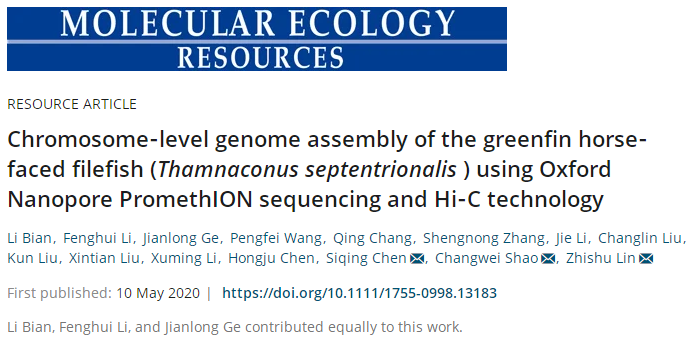 2020年5月,中國(guó)水產(chǎn)科學(xué)研究院黃海水產(chǎn)研究所陳四清研究員團(tuán)隊(duì)與北京百邁客生物科技有限公司合作完成了超高質(zhì)量的綠鰭?cǎi)R面鲀基因組,相關(guān)研究成果發(fā)表在知名期刊Molecular Ecology Resources上。本次研究基于納米孔測(cè)序技術(shù)(Nanopore)和染色體構(gòu)象捕獲技術(shù)(Hi-C)完成的基因組僅包含242個(gè)Contigs,Contig N50高達(dá)22.46 Mb,并將99.44%序列掛載到20條染色體上,實(shí)現(xiàn)了海洋魚類基因組組裝質(zhì)量質(zhì)的飛躍。