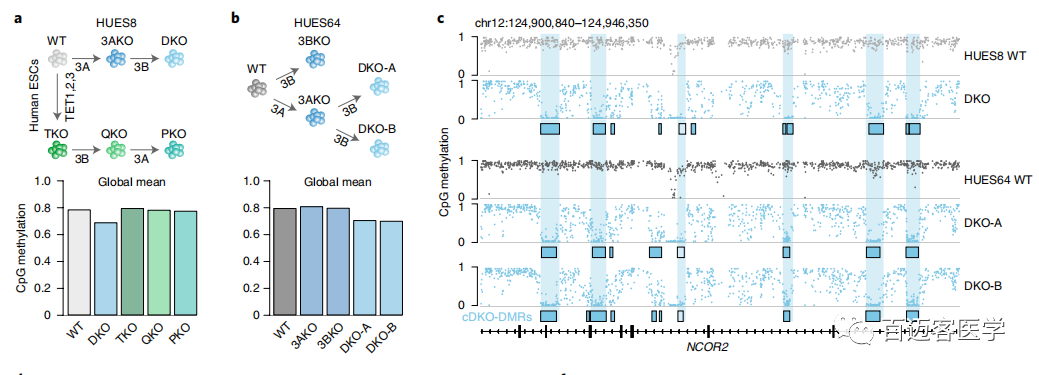 尚無研究直接比較喪失所有去甲基酶和甲基轉(zhuǎn)移酶化對(duì)轉(zhuǎn)錄和基因組調(diào)控以及細(xì)胞活性的影響。為了檢查去除所有DNA甲基化活性調(diào)節(jié)蛋白的分子后果,作者生成了在DNMT3A和-3B以及所有3個(gè)TET蛋白均缺失的五元敲除( pentuple-knockout,PKO)人類ESC進(jìn)行相關(guān)研究。