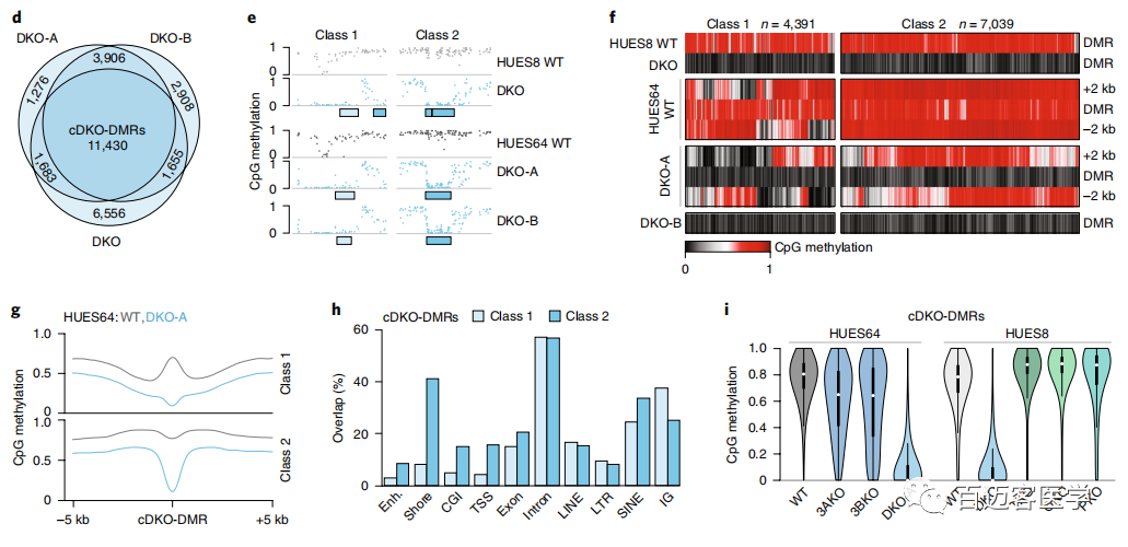 為了進(jìn)一步研究這種甲基化缺失,接下來從另一個(gè)人類ESC系(HUES64)(包括2個(gè)獨(dú)立的DKO克?。ˋ和B))WT和DKO細(xì)胞進(jìn)行了甲基化測(cè)序,并將甲基化水平與先前衍生的18個(gè)單DNMT3A-/-(3AKO)和單DNMT3B-/-(3BKO)敲除數(shù)據(jù)作比較(圖1b)。兩種不同的雄性WT ESC似乎具有可比性,具有相似的整體甲基化平均值(HUES64,0.79;HUES8,0.78),并且在1kb分辨率上具有較高的相關(guān)性(Pearson系數(shù)=0.93)。有趣的是,盡管第22代的單DNMT3基因敲除仍保持高度甲基化(3AKO,0.81;3BKO,0.79),但2個(gè)HUES64 DKO克隆僅經(jīng)過3代后甲基化降低至0.70(圖1b)。當(dāng)我們以堿基對(duì)的分辨率檢查數(shù)據(jù)時(shí),觀察到2個(gè)不同的動(dòng)態(tài)類別:0.1-0.2的細(xì)微下降,影響了整個(gè)基因組范圍內(nèi)約10%的CpG,以及,在CpG島內(nèi)局部發(fā)生的甲基化幾乎完全喪失的CpG位點(diǎn)(圖1c)。使用嚴(yán)格的標(biāo)準(zhǔn)(甲基化差異> 0.6,P <0.01,F(xiàn)檢驗(yàn))來定義差異甲基化區(qū)域(DMR)。DKO-DMR在3個(gè)DKO譜系上都非常一致(圖1c,d)。因此,定義了在所有3個(gè)樣品中均被甲基化的“一致性”的11,430個(gè)cDKO-DMR,cDKO-DMR始終保持較低水平(平均WT,0.749;DKO,0.086),平均長(zhǎng)度為688個(gè)堿基對(duì)(bp)。WT ESC中大約三分之一cDKO-DMR鄰近低甲基化區(qū)域,例如CpG島和轉(zhuǎn)錄起始位點(diǎn)(稱為“1類”),而其余的cDKO-DMR則位于其他高度甲基化的區(qū)域(內(nèi)含子或基因間),具有明顯的高甲基化邊界(稱為“第2類”;圖1e–h)。幾乎所有的cDKO-DMR(93%)都被DNMT3A或-3B甲基化,僅在DKO中被完全去甲基。