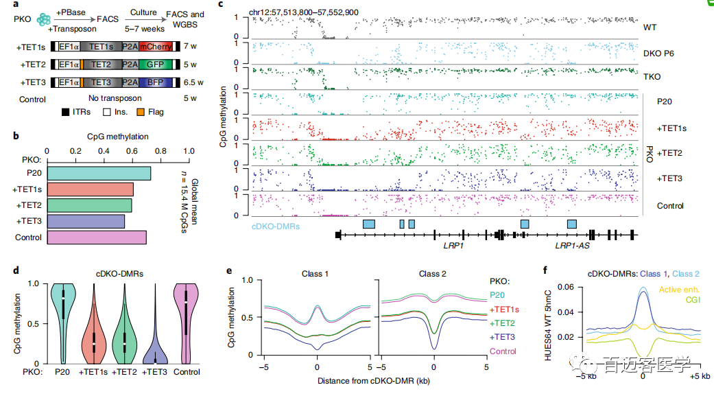 為了驗(yàn)證cDKO-DMR是否依賴并持續(xù)誘導(dǎo)TET活性,利用PiggyBac轉(zhuǎn)座將外源TET1(短isoform簡(jiǎn)稱TET1s)、TET2和TET3重新引入PKO細(xì)胞中,并使用WGBS測(cè)量了總體甲基化水平(圖2a)。在異位表達(dá)每種蛋白質(zhì)后,PKO細(xì)胞的總體平均甲基化水平從第20代的0.73明顯降低到了異位表達(dá)每種蛋白質(zhì)后的0.61、0.59和0.54,而僅用轉(zhuǎn)座酶轉(zhuǎn)染的對(duì)照細(xì)胞保持穩(wěn)定(平均值=0.70;圖2b)。重新引入任何TET酶可在很大程度上恢復(fù)TKO細(xì)胞中異常高甲基化的區(qū)域,誘導(dǎo)快速的cDKO-DMR去甲基化(圖2c-e)。從機(jī)理的角度來看,TET1s亞型缺乏CXXC結(jié)構(gòu)域,無法募集至未甲基化的CpG密集區(qū)域,但TET1和TET2 rescue結(jié)果之間無明顯差異,支持了CXXC結(jié)構(gòu)域無關(guān)的募集機(jī)制。TET及其作用相反的酶在cDKO-DMRs上的持續(xù)動(dòng)態(tài)也得到了已發(fā)表的染色質(zhì)免疫沉淀的支持,隨后進(jìn)行ChIP-seq,該數(shù)據(jù)表明WT ESC中DNMT3B和TET1均富集,盡管富集在比相當(dāng)狹窄且定義明確的cDKO-DMR邊界更寬區(qū)域。最后,進(jìn)行了全基因組氧化亞硫酸氫鹽測(cè)序(oxBS),并在WT細(xì)胞中發(fā)現(xiàn)了5hmC的顯著局部富集(平均cDKO-DMRs,0.07;背景,0.01;圖2f)。