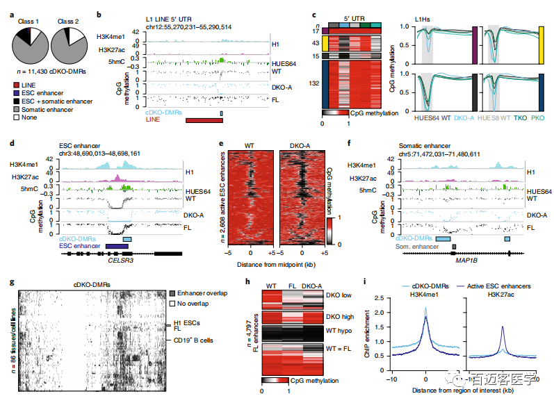 盡管TET可以募集到LINE 5’UTR,但它們更頻繁地定位于啟動(dòng)子或活性增強(qiáng)子,使它們保持低甲基化狀態(tài)。的確,有7%的cDKO-DMR與低甲基化的活性增強(qiáng)子相鄰,支持了先前的證據(jù)表明DNMT3s保護(hù)了增強(qiáng)子的邊界免受擴(kuò)展的低甲基化作用(圖3a,d,e)。考慮到TETs在活性增強(qiáng)子中的典型作用,作者認(rèn)為也可能代表僅在其他細(xì)胞狀態(tài)被激活時(shí)才經(jīng)歷去甲基化的調(diào)節(jié)元件。令人驚訝的是,有85%的cDKO-DMR與至少一種先前定義的組織特異性增強(qiáng)子重疊,并且在相關(guān)的細(xì)胞類型中被特異去甲基化(圖3a,f,g)。盡管cDKO-DMR幾乎總是體細(xì)胞增強(qiáng)子,但事實(shí)并非如此:許多體細(xì)胞增強(qiáng)子已經(jīng)在ESC中甲基化,在其相關(guān)組織中保持高度甲基化,或者盡管在其他發(fā)育過程中失去了甲基化,但在ESC中并未顯示出TET依賴性去甲基化(圖3h)。為了探索DMR的穩(wěn)定性,進(jìn)一步傳代了HUES64 DKO克隆A細(xì)胞并進(jìn)行了WGBS。在經(jīng)過28次無DNMT3活性的傳代后,鑒定到增加了59,618個(gè)DKO-DMR,其中79%與推定的組織特異性增強(qiáng)子重疊。在后期傳代的DKO細(xì)胞中,約有三分之一的體細(xì)胞增強(qiáng)子仍保持甲基化狀態(tài)。為了檢查增強(qiáng)子去甲基化的能力是否與發(fā)育時(shí)期相關(guān)(它們?cè)诎l(fā)育過程中被激活時(shí)),利用最近發(fā)表的數(shù)據(jù)集,詳細(xì)介紹了從HUES64 ESCs到胰島分化的9個(gè)階段中增強(qiáng)子的激活和甲基化動(dòng)力學(xué)。有趣的是,在分化的每個(gè)階段,相似比例的增強(qiáng)子與DKO-DMR重疊,在末端分化的階段,其頻率略高。盡管是推測(cè)性的,與ESC分化之間缺乏明顯聯(lián)系表明,一部分胚胎和成年組織特異性增強(qiáng)子可能以依賴于DNMT3和TET的持續(xù)和相反功能的狀態(tài)存在。
