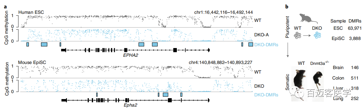 為了探索這種局部調(diào)節(jié)的動(dòng)態(tài)甲基化的保守性,在小鼠表皮干細(xì)胞(EpiSCs)中突變了Dnmt3a和Dnmt3b,因?yàn)樗鼈兇砹伺c人類多能細(xì)胞最接近的發(fā)育和分子類似物。在第4步對(duì)WT和DKO細(xì)胞進(jìn)行了WGBS測(cè)序,并鑒定了3888個(gè)與人類DKO-DMR具有相似特性的DMR,與82%的推定體細(xì)胞增強(qiáng)子重疊。雖然數(shù)量、√確序列和坐標(biāo)未直接在物種之間map,但小鼠DKO-DMR出現(xiàn)在非常相似的位置且與直系同源基因接近(圖4a)。因此,在體細(xì)胞增強(qiáng)子處甲基化轉(zhuǎn)換的機(jī)制和這些區(qū)域的調(diào)控模式都看起來非常保守。