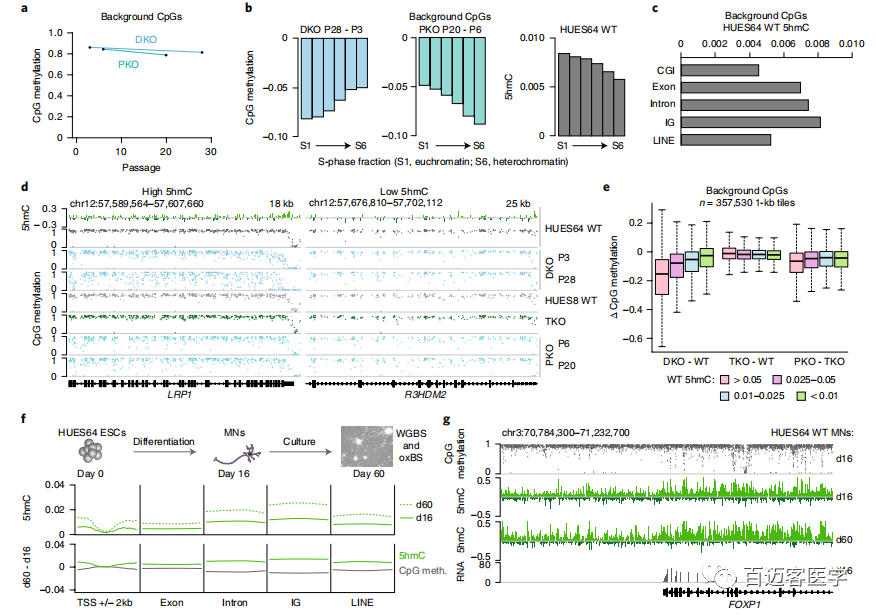 將WT HUES64 ESC分化為有絲分裂后的運(yùn)動(dòng)神經(jīng)元,其中5hmC不能通過分裂被動(dòng)稀釋,以更具體地跟蹤TET的參與度和催化活性。培養(yǎng)60天后,基因(特別是表達(dá)的基因)和基因間基因座內(nèi)富集了5hmC水平,其中*大的增加發(fā)生在惰性染色質(zhì)內(nèi),支持了TET的廣泛氧化(圖5f,g)。因此,TET通過運(yùn)動(dòng)神經(jīng)元以及ESC的基因組保持了廣泛氧化甲基胞嘧啶的能力。