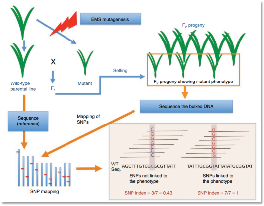 (1)該文章提出了一種針對(duì)化學(xué)誘變劑的點(diǎn)突變性狀的定位方法—mutmap,該方法是目前在做植物誘變性狀研究的主要方法。