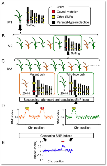 (1)該文章是對(duì)突變性狀定位的一種延伸,也是對(duì)mutmap方法的一個(gè)補(bǔ)充,主要區(qū)別是如果隱形突變個(gè)體無(wú)法正常發(fā)育在幼苗期出現(xiàn)死亡,因此無(wú)法與野生親本雜交構(gòu)建分離群體,所以該方法巧妙的選擇了突變位點(diǎn)雜合的個(gè)體進(jìn)行自交,從而在自交M3或者M(jìn)4選擇極端個(gè)體構(gòu)建混池進(jìn)行后續(xù)分析。