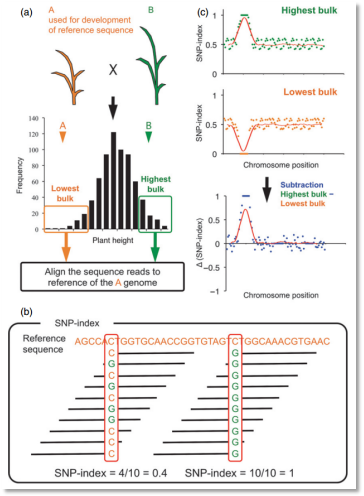 BSA(bulked segregant analysis)又叫集群分離分析法,該方法主要是選擇雙親群體分離后代中具有極端表型的個(gè)體進(jìn)行混樣,通過(guò)比較不同極端混樣池之間的多態(tài)性標(biāo)記的差異,從而篩選出與性狀相關(guān)的分子標(biāo)記,實(shí)現(xiàn)目標(biāo)基因的定位。BSA分析早期使用的都是傳統(tǒng)分子標(biāo)記,根據(jù)標(biāo)記與性狀共分離(緊密連鎖)得到定位區(qū)間,不過(guò)由于其標(biāo)記密度低、定位精度差、實(shí)驗(yàn)操作繁瑣已經(jīng)逐漸不再使用。近年來(lái),BSA方法和高通量測(cè)序相結(jié)合,通過(guò)比較不同混池間SNP的頻率差異或者比較混池間純合SNP的密度的差異,實(shí)現(xiàn)基因的定位,高通量測(cè)序方式以其簡(jiǎn)單、快速、準(zhǔn)確、高性價(jià)比的特點(diǎn)受到科研工作者的青睞。那么,對(duì)于不了解BSA的研究者來(lái)說(shuō),如何快速了解BSA的發(fā)展歷程、原理方法、應(yīng)用領(lǐng)域,如何快速上手BSA分析,今天大師兄為大家推薦幾篇BSA代表性文章,讓你輕松搞定BSA,趕緊上車(chē)。