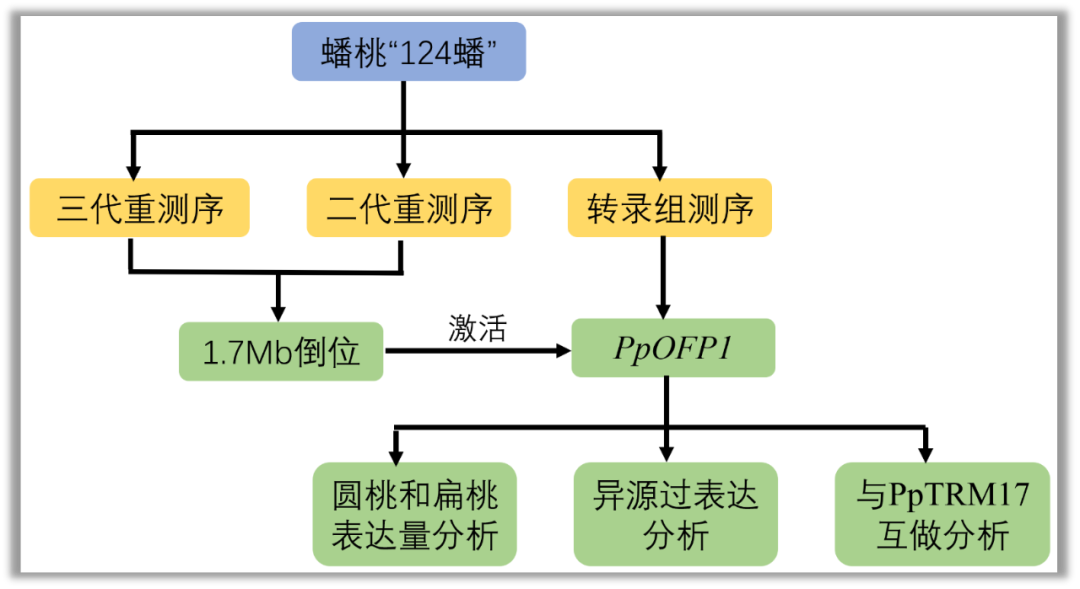文章結(jié)合三代測序、轉(zhuǎn)錄組測序、轉(zhuǎn)基因、蛋白互做分析等發(fā)現(xiàn)和證明了蟠桃變扁的原因,蟠桃6號染色體上存在1個1.7Mb的倒位,而在圓桃中并不存在,該遺傳變異的產(chǎn)生可以激活PpOFP1表達,而PpOFP1的過表達可以抑制桃子果實的縱向發(fā)育,從而形成蟠桃扁平的表型。文章從側(cè)面也反映出引起性狀變異的原因不僅僅是基因序列上的差異,大的結(jié)構(gòu)變異同樣也會造成性狀的變化??傮w來說,文章思路清晰,結(jié)構(gòu)嚴謹,為林木等多年生物種開展重要性狀的遺傳研究提供新的思路,文章后續(xù)也可以結(jié)合染色體互做分析(如Hi-C)去探究倒位區(qū)域與PpOFP1之間的互做關(guān)系,分析增強子在桃子果實發(fā)育中的重要作用。