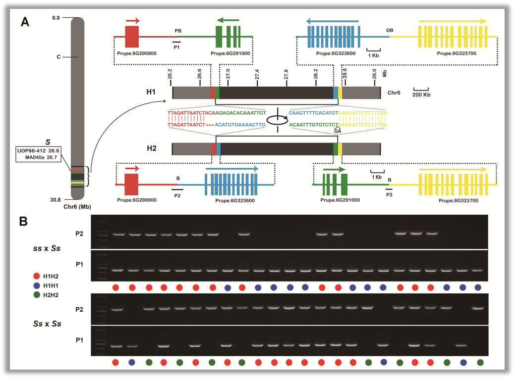 圖1?? 6號染色體上S位點下游的1.7Mb倒位以及其在不同表型樣品中的分型