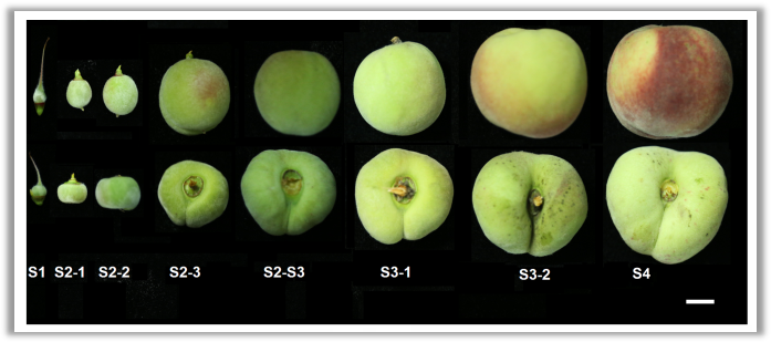 桃起源于250萬年前的中國青藏高原的西南部,在中國已有4000年的栽培史,其中有一個獨特變種—蟠桃,蟠桃果實呈扁平狀,體積較小,和我們常見的圓形桃子有明顯區(qū)別,雖然長相一般,不過它具有酸度低、糖含量高等優(yōu)異品質(zhì),受到越來越多的消費者喜愛。蟠桃果實扁平的特征受6號染色體上的S位點調(diào)控,同時S位點與控制鮮重和果實敗育位點緊密連鎖。關(guān)于S位點的基因定位研究有多次報道,發(fā)現(xiàn)2個臨近候選基因(CAD1和LRR-RLK)與果實扁平的性狀共分離,但后續(xù)又有研究顯示這2個基因并非與CAD1和LRR-RLK共分離。所以,對于扁桃扁平性狀的遺傳基礎(chǔ)研究仍待繼續(xù)。