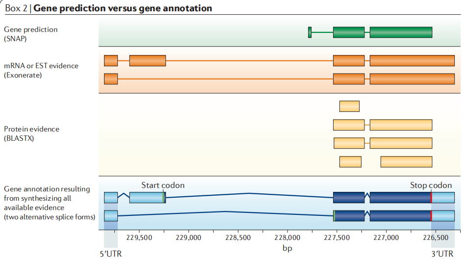 (3)基于轉(zhuǎn)錄組預(yù)測(transcriptome-based prediction):指通過物種各個(gè)組織混合的RNA-seq和三代全長轉(zhuǎn)錄本數(shù)據(jù)數(shù)據(jù)來輔助預(yù)測。由于轉(zhuǎn)錄組這種數(shù)據(jù)是轉(zhuǎn)錄本結(jié)構(gòu)的直接反應(yīng),因而利用此種類型數(shù)據(jù),可以比較真實(shí)準(zhǔn)確的確定外顯子區(qū)域和剪切位點(diǎn),在基因預(yù)測三種策略中屬于可靠性最高的策略。常用的軟件有PASA、TransDecoder、GeneMarkS-T等。