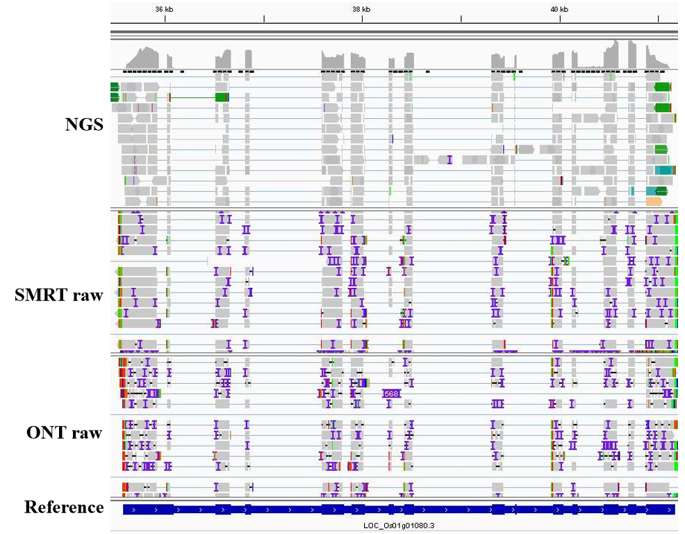 基于三代測序平臺(tái)可以直接獲取轉(zhuǎn)錄本的5ˊ到3ˊ高質(zhì)量全長序列,無需組裝,一條read即可跨越全長轉(zhuǎn)錄本,因此通過將read比對基因組就能夠非常容易的確定基因在基因組上的位置和其完整結(jié)構(gòu),因而非常有利于基因的注釋工作,且準(zhǔn)確性較高(參見下圖以水稻一個(gè)基因?yàn)槔?/p>