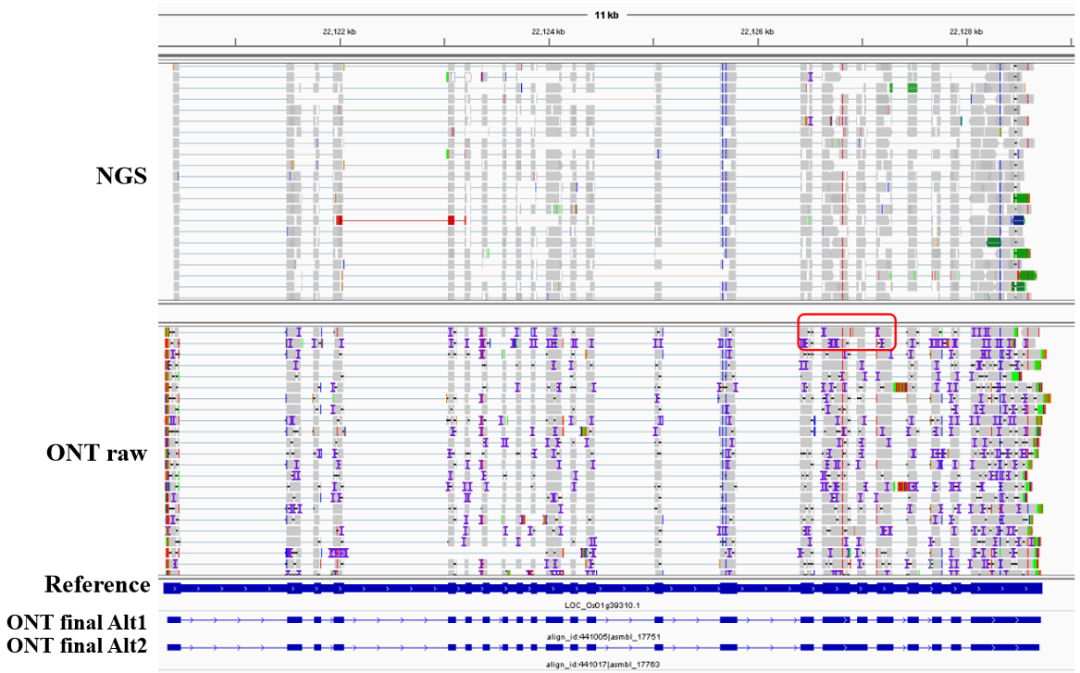 圖5中分別展示了RNA-seq和ONT原始數(shù)據(jù)比對結(jié)果,參考基因的結(jié)構(gòu)和經(jīng)過NanoGAP糾正和聚類后此位置轉(zhuǎn)錄本的結(jié)構(gòu)。其中NanoGAP預(yù)測到的ONT final Alt1轉(zhuǎn)錄本,其結(jié)構(gòu)與參考基因結(jié)構(gòu)完全一樣,證明我們采ONT數(shù)據(jù)進(jìn)行預(yù)測的高準(zhǔn)確性。同時(shí)NanoGAP預(yù)測到的一個(gè)新的可變剪接ONT final Alt2,表明擁有更長讀長的ONT在獲取可變剪接方面存在一定優(yōu)勢。