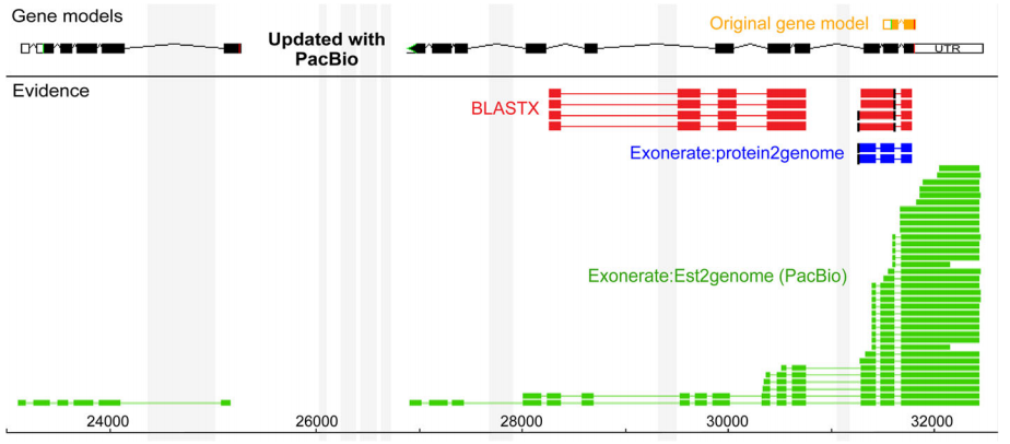 進(jìn)一步的基因鑒定結(jié)果顯示,基于二代轉(zhuǎn)錄本的BLASTX(紅色)和protein2genome(藍(lán)色)預(yù)測了一個(gè)短基因模型,但是全長轉(zhuǎn)錄序列(綠色)擴(kuò)展了現(xiàn)有的基因,并預(yù)測了一個(gè)新的基因[3]。除此之外,研究者通過三代全長技術(shù)共鑒定1609個(gè)(9.2%)新基因,表明了全長轉(zhuǎn)錄組的加入使基因注釋更豐富。