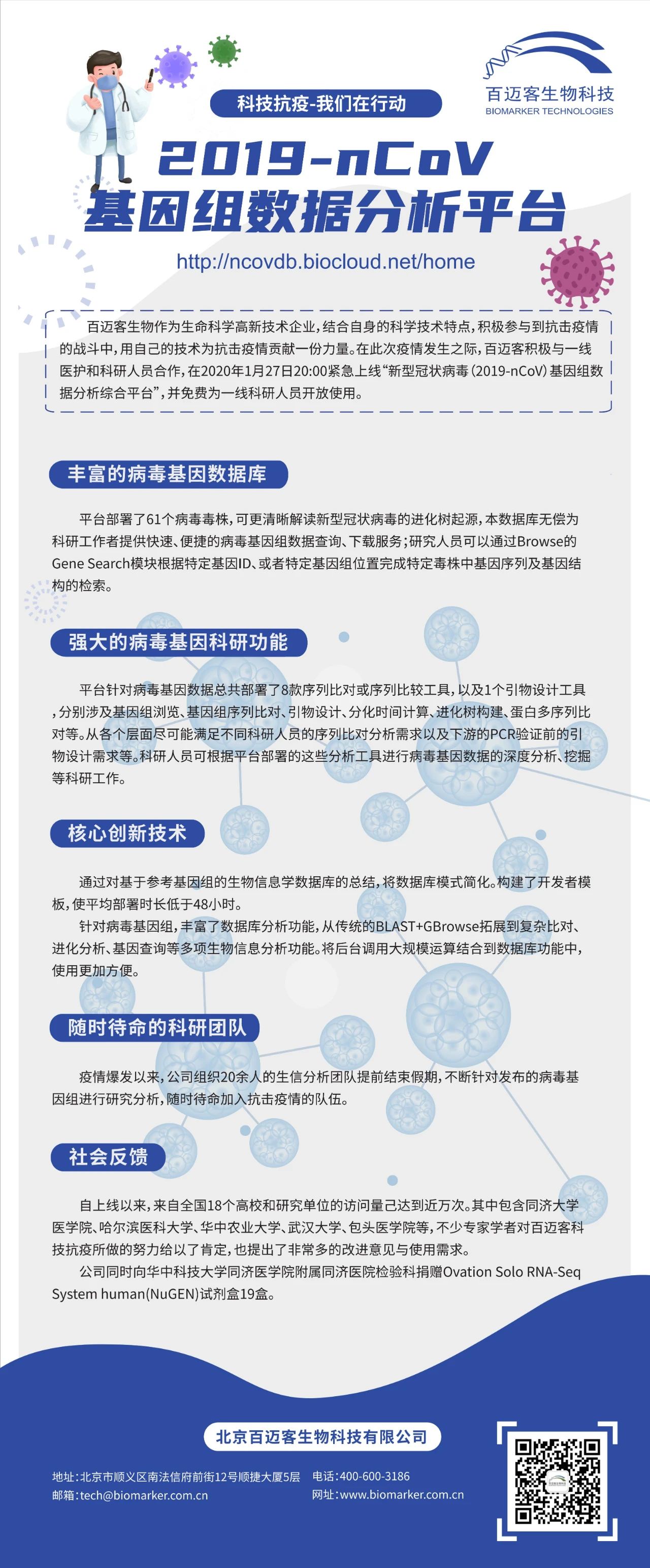 在疫情防控這個(gè)特殊的戰(zhàn)場(chǎng),百邁客作為三代測(cè)序和生物云-BMKCloud服務(wù)提供商,結(jié)合自身的技術(shù)特點(diǎn),在疫情爆發(fā)初期積極的參與到抗擊疫情的戰(zhàn)斗中,與一線的醫(yī)護(hù)和科研人員合作,結(jié)合一線的需求,積極調(diào)動(dòng)各種資源,經(jīng)過(guò)十幾天夜以繼日的開(kāi)發(fā),通過(guò)對(duì)各數(shù)據(jù)庫(kù)中的新型冠狀病毒數(shù)據(jù)進(jìn)行合理整合分析,于2020年1月27日20:00時(shí)及時(shí)上線了首版“2019-nCoV新型冠狀病毒基因組數(shù)據(jù)分析平臺(tái)”(http://ncovdb.biocloud.net/home)?。本數(shù)據(jù)庫(kù)配合國(guó)家公共資源數(shù)據(jù)庫(kù)為社會(huì)提供更全面、及時(shí)、準(zhǔn)確的數(shù)據(jù)資源。為我們的一線科研人員提供免費(fèi)服務(wù)。
