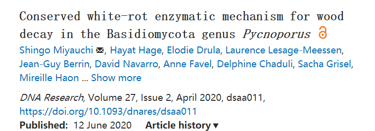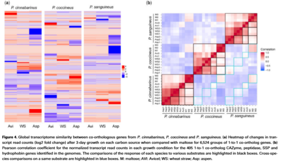 本文通過比較基因組,轉(zhuǎn)錄組和蛋白組等多組學方法對擔子菌門下的密孔菌屬的真菌進行研究,發(fā)現(xiàn)它們在木材降解反應中存在著一些保守的酶學反應特征,包括產(chǎn)過氧化氫酶和耗過氧化氫酶協(xié)同作用,纖維二糖脫氫酶和AA9溶解性多糖單氧酶協(xié)同作用。