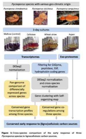 選取四種不同地理分布的擔子菌門/密孔菌屬真菌(P.coccineus、P.sanguineusand、P. puniceus、P.cinnabarinus)研究其在不同類型的纖維素基質(zhì)下相關酶的代謝情況。通過設置不同碳素培養(yǎng)基:麥芽糖(對照)、秸稈、松木、楊木,模擬對自然界中不同材質(zhì)的木材的分解能力。探究Pycnoporus屬在基因組、轉(zhuǎn)錄組、分泌蛋白組層面的共性和差異性,以期找出它們在木質(zhì)纖維素降解上存在的共性機制。