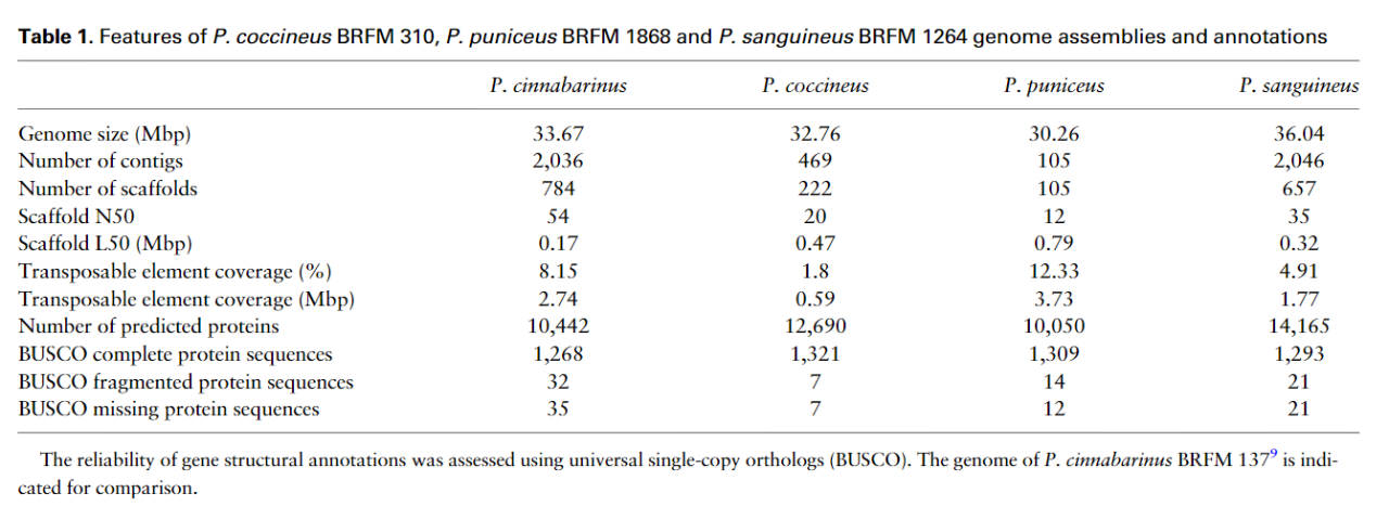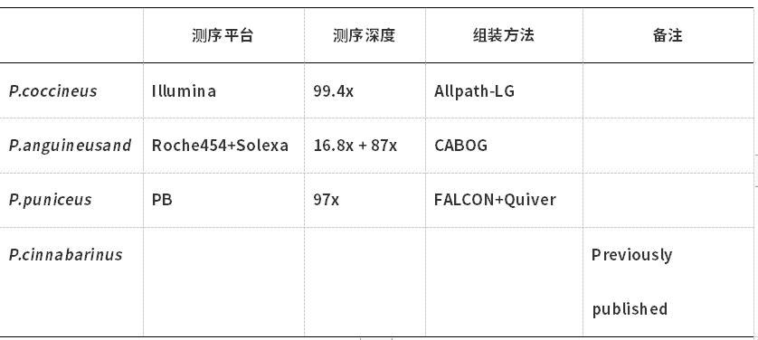 分別對P.coccineus、P.sanguineusand、P. puniceus、P.cinnabarinus的基因組進行測序和組裝,四種真菌基因組大小差異不大,編碼基因組的數(shù)量上也比較接近。