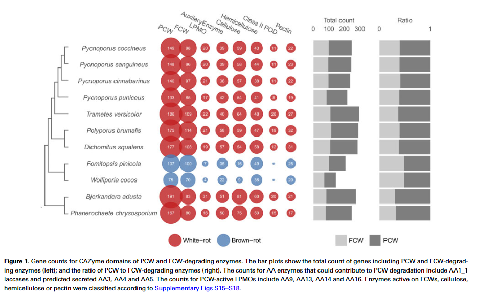 與褐腐菌相比,白腐菌含有更高比例的PCW(植物細胞壁)降解活性相關的CAZymes和FCW(真菌細胞壁)降解活性相關的CAZymes,這也是白腐菌與褐腐菌降解木質(zhì)纖維素的能力不同的重要原因。