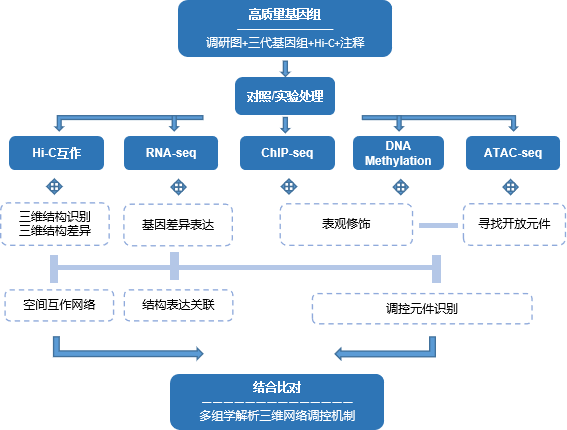 表觀遺傳(epigentics) “epi”表示“其上”或“超越”,genetics只設(shè)計(jì)基因的結(jié)構(gòu)層次,而epigenetics則涉及基因如何發(fā)揮其功能以及基因間的互作關(guān)系?;蚪M結(jié)合表觀調(diào)控可更加深入的剖析物種在何時(shí)、何地、以何種方式去應(yīng)用遺傳信息的指令。多種表觀遺傳研究手段間可相互組合,從三維基因、修飾表達(dá)、調(diào)控元件等多種層面解析不同調(diào)控原理。