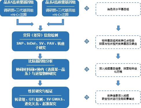 對于大部分動植物,其測序主要基于單一品種作為參考基因組。單一基因組測序通常只能覆蓋基因組的80%~90%,且通常只有代表馴化的優(yōu)良品種的單一基因型能夠被準(zhǔn)確檢測到,因此不同生態(tài)型重測序數(shù)據(jù)一般只有50%~80%能比對到參考基因組上。而通過對兩種品系基因組進(jìn)行denovo(或者與已發(fā)表品系進(jìn)行研究),充分比較其間的基因組變異信息,可以更好的對不同生態(tài)型進(jìn)行表型功能差異分析。結(jié)合兩種生態(tài)型品種雜交子代圖譜,將極大的利于后續(xù)性狀與功能研究。與動物相比植物更具有品種多樣性,因此該研究方案目前更多的應(yīng)用于植物材料中。