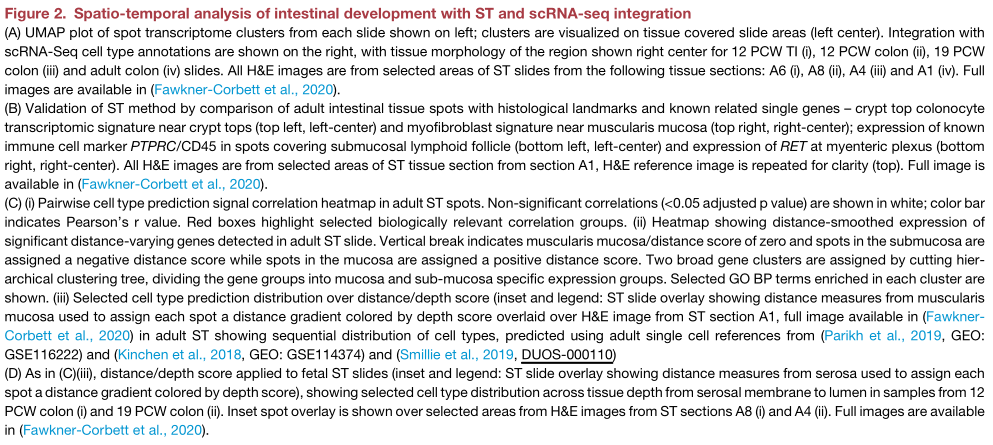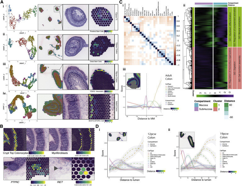 研究人員鑒定了2,893個(gè)與深度相關(guān)的基因(<5%FDR),反映了不同層次的活躍途徑(Figure Cii) -肌肉/神經(jīng)過程(收縮/軸突形成)向吸收管腔功能(微絨毛組織和消化系統(tǒng)過程)發(fā)展的深度富集點(diǎn),與細(xì)胞類型特征的順序富集相符(Figure?2Ciii)。在胎兒ST顯著的差異包括外肌層和內(nèi)肌層在19個(gè)PCW時(shí)占據(jù)離散的空間層,而不是12個(gè)PCW時(shí)(Figure 2D)。