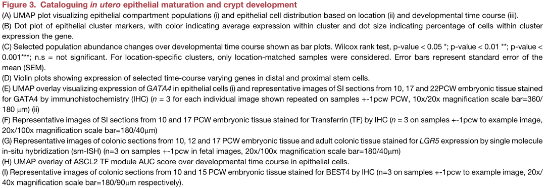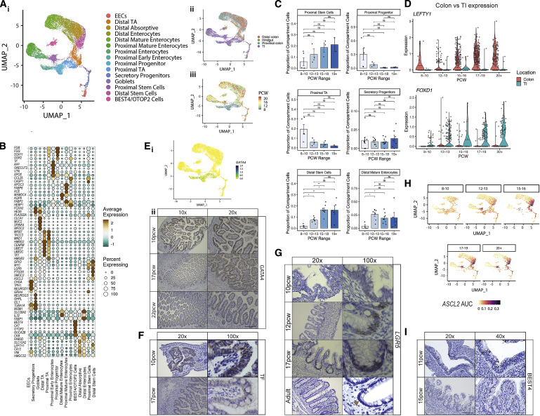 研究人員觀察到近端和遠(yuǎn)端ISCs隨著時(shí)間的推移逐漸增加。這與ISC轉(zhuǎn)錄程序的早期位置差異形成對(duì)比,例如遠(yuǎn)端LEFTY1和近端FOXD1及其下游調(diào)控網(wǎng)絡(luò)基因(Figure3C,3D和S3B)。這些差異由關(guān)鍵的位置信號(hào)轉(zhuǎn)通路支撐,例如,結(jié)腸LEFTY1通過激活素A受體(ACVR2B)參與了假定的神經(jīng)相互作FigureS3?C1)。在早期發(fā)育中(<12 PCW),研究人員發(fā)現(xiàn)了近端上皮干樣祖細(xì)胞群,該細(xì)胞群發(fā)展為早期腸上皮細(xì)胞。這些細(xì)胞表現(xiàn)出許多原始功能,包括在中胚層分化重要的VTN基因高表達(dá),與ISCs相比,LGR5表達(dá)較少,和ONECUT2表達(dá)參與上皮發(fā)育(Figure 3B和FigureS3?D)。這些細(xì)胞在SI中特異表達(dá)TF GATA4(Figure3Ei), SI是一種小鼠早期內(nèi)胚層調(diào)節(jié)因子,在12 PCW后,其表達(dá)大部分丟失這些細(xì)胞高表達(dá)轉(zhuǎn)鐵蛋白(TF)( Figure3B和3F),證實(shí)了鐵代謝在絨毛形成中的重要性。LGR5是一種典型的ISC基因,在妊娠早期(<12 PCW)的近端/遠(yuǎn)端廣泛檢測到低水平ISCs和干樣祖細(xì)胞(Figure3B和FigureS3D)。原位雜交(ISH)證實(shí)了在10PCW處彌漫的LGR5表達(dá),后來定位于隱窩堿基(Figure3G),類似于在雞和小鼠發(fā)育中報(bào)道的Lgr5的行為。即使在隱窩形態(tài)建立之后(如19 PCW之后),ISC仍分別構(gòu)成遠(yuǎn)端/近端樣本中捕獲的上皮細(xì)胞的18%–22%(Figure3C),高于成人結(jié)腸的scRNA-seq研究捕獲的3%-4%。與此相符,研究人員發(fā)現(xiàn)ASCL2?TF模塊(包括下游目標(biāo)LGR5)隨著發(fā)育時(shí)間的增加而顯著增加(Figure3H)。