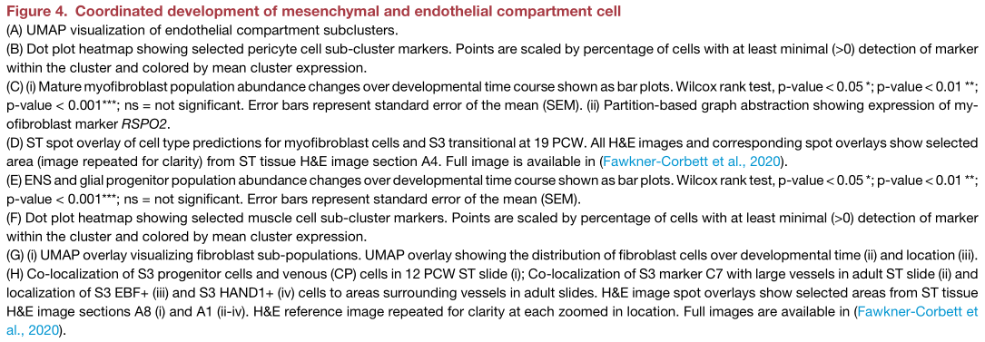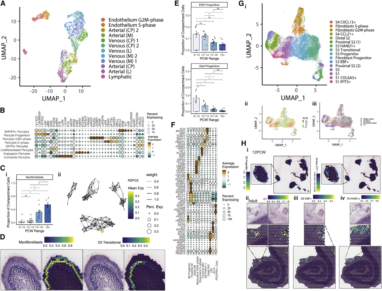 轉(zhuǎn)錄標(biāo)簽通常對(duì)應(yīng)于結(jié)構(gòu)特征。在EC中可以清楚地看到這一點(diǎn),將EC分為靜脈,動(dòng)脈和淋巴管類型,并通過血管大小進(jìn)一步區(qū)分(Figure4?A;TableS1)。在發(fā)育過程中,觀察到了從小血管到大血管的過渡,反映了腸道血管生成(Figure S4?A)。確定了驅(qū)動(dòng)這種變化的TF網(wǎng)絡(luò),例如動(dòng)靜脈分化器HEY1和SOX13。成年ST的脈管系統(tǒng)很容易識(shí)別成年EC和胎兒EC信號(hào)(Figure S4?B)。與EC相對(duì)的,周細(xì)胞亞型由血管生成驅(qū)動(dòng)因子(PRRX1,THBS4和ANGPT2)定義(Figure 4?B;table S1)。ANGPT2是EC-周細(xì)胞RL相互作用的關(guān)鍵調(diào)節(jié)因子,已證實(shí)其位于胎兒脈管系統(tǒng)中(Figure S4C)。盡管EC隔室與8 PCW處存在的大血管細(xì)胞截然不同,但周細(xì)胞種群顯示出發(fā)育滯后。為了了解這些分化動(dòng)力學(xué),研究人員將G2M和S期周細(xì)胞與G1期細(xì)胞進(jìn)行了比較,發(fā)現(xiàn)在較早時(shí)間點(diǎn)的大多數(shù)細(xì)胞是高度循環(huán)的祖細(xì)胞(Figure S4?D)。這些種群與成纖維細(xì)胞和原始的ACTA2?+細(xì)胞共享轉(zhuǎn)錄特征,這一結(jié)果受到軌跡分析的支持(Figure S4?E)。綜上所述,提出了早期成纖維細(xì)胞向周細(xì)胞的轉(zhuǎn)變,然后是來自未成熟WNT6表達(dá)細(xì)胞的第二波周細(xì)胞增殖-分化。16 PCW時(shí),成熟的成肌纖維細(xì)胞表現(xiàn)出相似的發(fā)育滯后(Figure 4?Ci;table S1)。文獻(xiàn)表明腸道成肌纖維細(xì)胞可能來自多種來源,并且圖形抽象顯示成熟的成肌纖維細(xì)胞類似于肌肉細(xì)胞,在特定基因(例如RSPO2,F(xiàn)igure 4?Cii)中存在明顯差異。然而,肌成纖維細(xì)胞祖細(xì)胞卻表現(xiàn)出來自成纖維細(xì)胞和周細(xì)胞的梯度譜;在19 PCW的ST中,它們占據(jù)了與過渡間質(zhì)細(xì)胞相鄰和重疊的層。(Figure 4?D和S4?E)。