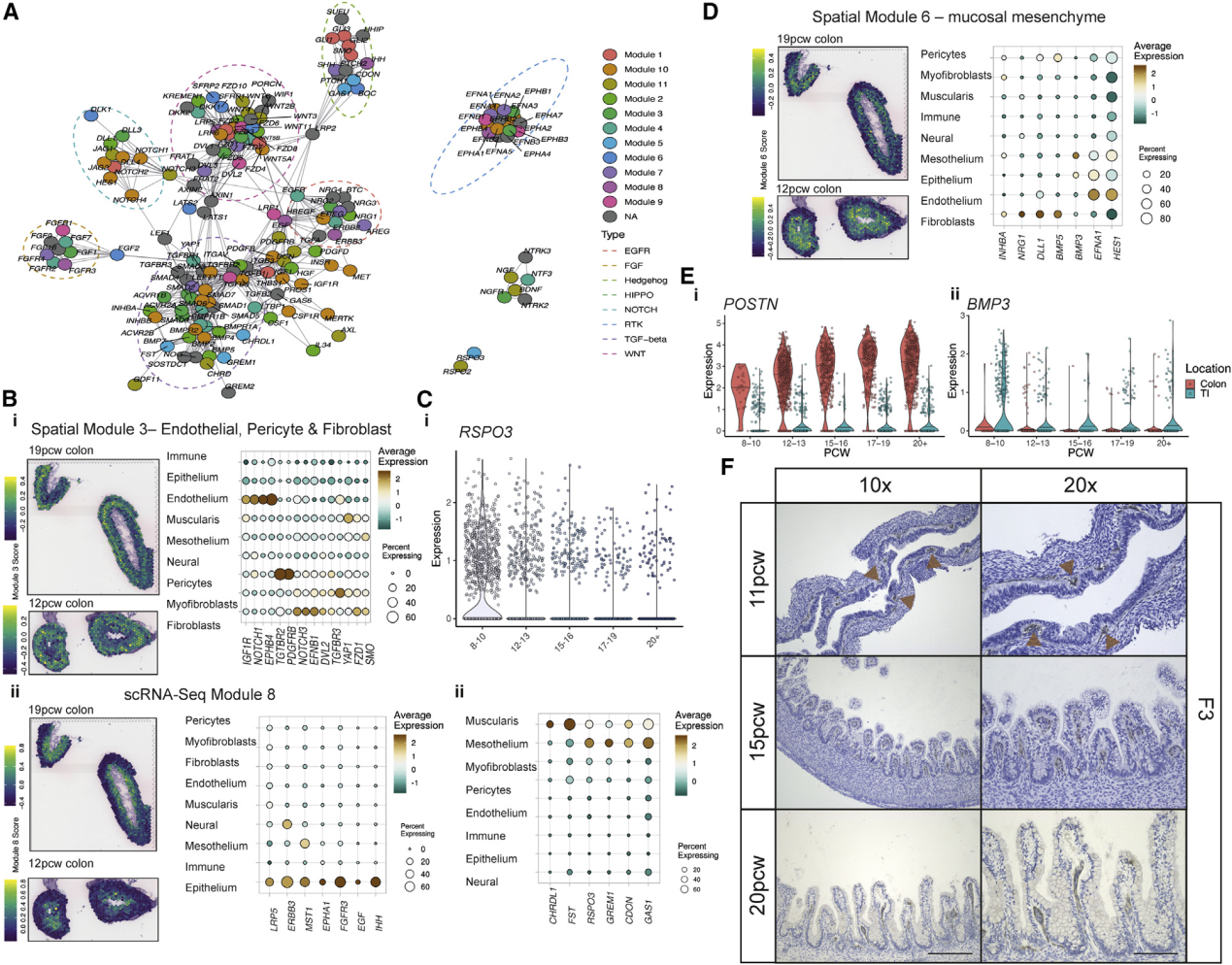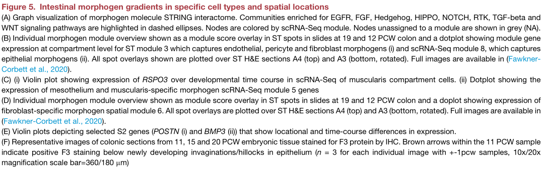 理解腸道發(fā)育的基本問題是局部形態(tài)發(fā)生梯度及其拮抗劑是如何塑造腸絨毛形態(tài)發(fā)生的。研究人員創(chuàng)建了一個(gè)涉及8條途徑的基因形態(tài)發(fā)生圖,用以闡明這些分子在空間和時(shí)間上的作用。利用共表達(dá)分析確定了11種細(xì)胞類型特異性和13種空間共定位的形態(tài)發(fā)生模塊,在所有ST中對(duì)模塊活性進(jìn)行了評(píng)分(Figure5A和S7?A)。這些模塊通常與ST中的組織深度對(duì)齊,空間模塊3由來自EC、成纖維細(xì)胞和周細(xì)胞起源的形態(tài)發(fā)生子組成,包括LRP1,并且在組織深處(Figure5?Bi)。上皮特異性模塊表達(dá)了Hedgehog通路(IHH)的基因,例如在Wnt信號(hào)中起重要作用的卷曲的共受體LRP5,并位于管腔附近(Figure5?Bii)。另一個(gè)含有肌纖維母細(xì)胞成分的細(xì)胞,具有形態(tài)發(fā)生原WNT2B和受體RSPO2,在12PCW時(shí)出現(xiàn)彌漫性,并在以后逐漸定位(FigureS7?B)。這與發(fā)現(xiàn)成熟的成肌纖維細(xì)胞在上皮成分后出現(xiàn)的發(fā)現(xiàn)一致,表明ISC-成纖維細(xì)胞信號(hào)傳導(dǎo)回路直到隱窩形成后才建立。WNT2B由間皮表達(dá),在成肌纖維細(xì)胞分化之前提供了配體的唯一來源(FigureS7B)。類似地,RSPO3,其可以用信號(hào)通知經(jīng)由ISC的LGR5(FigureS7Ci)在間皮/肌層模塊中很高,主要在12 PCW之前見到,然后隨著時(shí)間的流逝隨著組織深度的增加而消失(Figure5C)。這表明,隨著腸的生長,原本可能因?qū)娱g物理距離的增加而被打破的形態(tài)梯度,可以通過依次發(fā)育的細(xì)胞類型的表達(dá)而恢復(fù)。