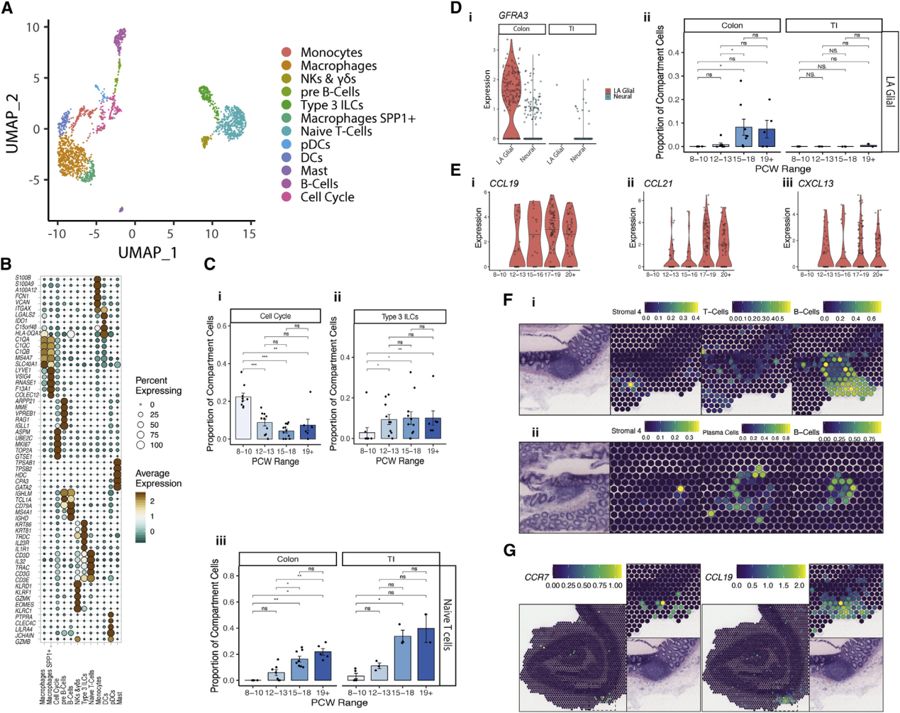 與PCW7-8晚期發(fā)展出現(xiàn)的細(xì)胞類型相反,腸神經(jīng)嵴來源的細(xì)胞沿胃腸道的長度遷移,進(jìn)入包含神經(jīng)元和膠質(zhì)細(xì)胞的粘膜下和肌間神經(jīng)叢。本研究的時(shí)間點(diǎn)(Figure4E)確定了不同的神經(jīng)元和神經(jīng)膠質(zhì)祖細(xì)胞,并捕獲了5個(gè)神經(jīng)膠質(zhì)細(xì)胞和7個(gè)神經(jīng)元簇(FigureS5 Ai;tableS1)。除了RL分析突出的不同ENS通路(圖S3C),同時(shí)還表明ENS與其他部分相比相對(duì)成熟。在ST中,ENS成分也被清楚地看作是肌間神經(jīng)(FigureS5 Aii)。