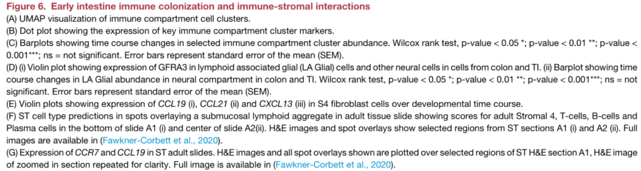 為了在空間上確認(rèn)這些相互作用,研究人員研究了成人ST,其中粘膜下淋巴濾泡被視為獨(dú)特的結(jié)構(gòu)。S4和免疫細(xì)胞(例如CD3和CD19)的關(guān)鍵標(biāo)記基因在這些卵泡中和周圍表達(dá),因子分析證實(shí)了各種成年免疫細(xì)胞(B細(xì)胞,T細(xì)胞和髓樣細(xì)胞)和此處定位的S4細(xì)胞類型(Figure6) F)。研究人員還發(fā)現(xiàn)ST中關(guān)鍵RL對(duì)的顯著共定位(包括CCR7 / CC19(1個(gè)點(diǎn)內(nèi)p = 1.098×10 -10,半徑內(nèi)p = 5.59×10 -49)(Figure6G)。表明S4細(xì)胞是成年結(jié)腸中與卵泡相鄰的成纖維細(xì)胞,在胎兒GALT發(fā)育過程中以時(shí)間依賴性方式出現(xiàn)。
