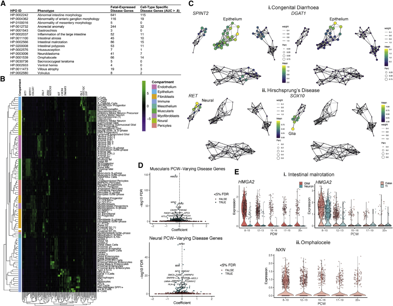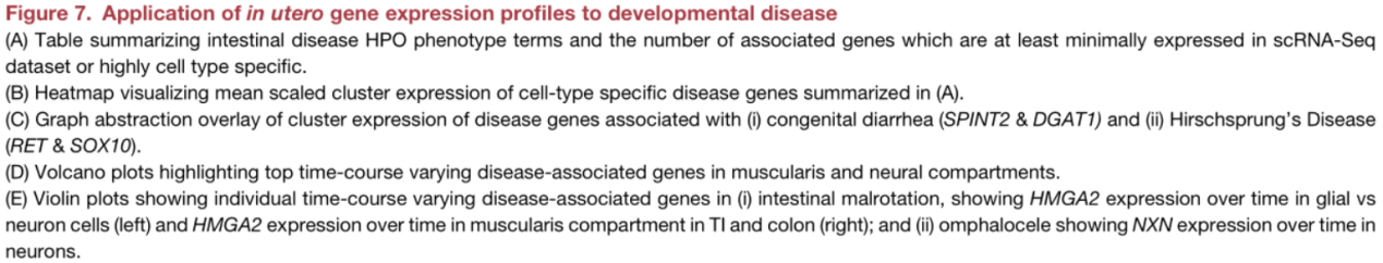 該研究在時(shí)間方面允許研究隨著發(fā)育時(shí)間而變化的疾病基因(Figure7D),并可以提供與時(shí)間相關(guān)的信息,突出顯示PCW前12膠質(zhì)細(xì)胞和IM祖細(xì)胞表達(dá)的基因HMGA2(分別為FDR<2.2e-16)(Figure7Ei),與腸道旋轉(zhuǎn)不良有關(guān)(12q14微缺失綜合癥,ORPHA:94063)。同樣,早期抑制運(yùn)動(dòng)神經(jīng)元特異的NXN的致病變體(Figure7Eii)會(huì)導(dǎo)致卵泡擴(kuò)張(Robinow綜合征,OMIM:618529)。在此發(fā)育時(shí)期,腸子回到了腹部,表明ENS細(xì)胞和肌肉祖細(xì)胞可能對(duì)該過程至關(guān)重要。