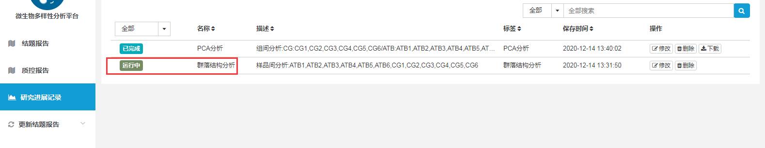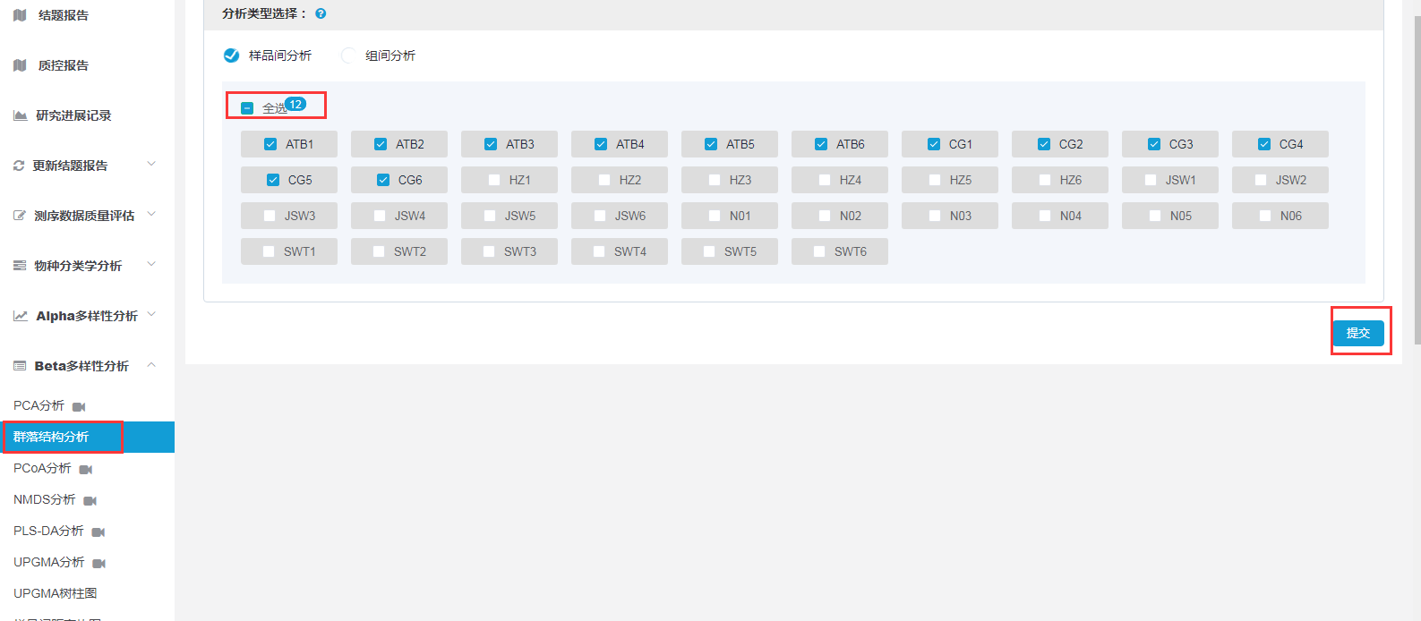 云平臺(tái)上關(guān)于群落結(jié)構(gòu)分析的操作非常簡(jiǎn)單,打開(kāi)結(jié)題報(bào)告后點(diǎn)擊“Beat多樣性分析”中的群落結(jié)構(gòu)分析,選中需要分析的樣品點(diǎn)擊提交,然后可以在分析記錄界面查看分析結(jié)果(由于會(huì)做999次重復(fù)計(jì)算,大家耐心等待哦)。