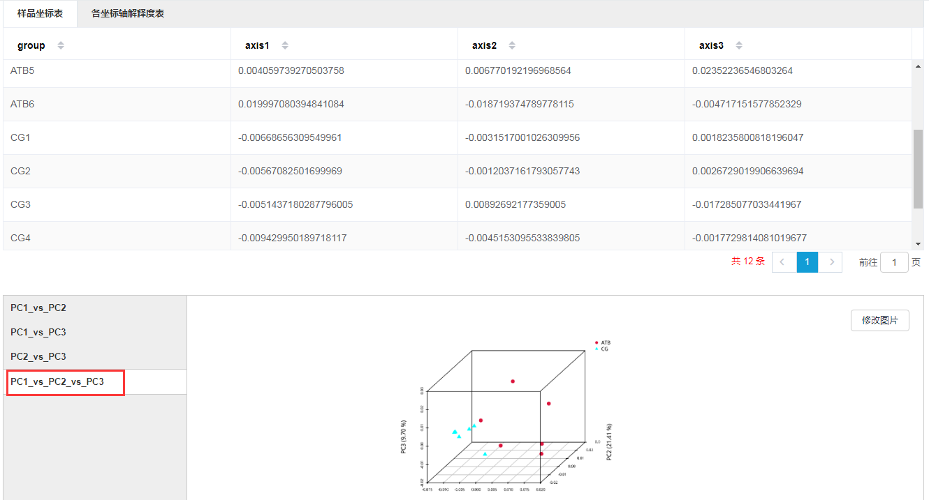 PCA/PCoA分析通常使用第一軸和第二軸的信息展示樣品或者分組之間的聚集和差異,當(dāng)?shù)谝惠S和第二軸不足以展示組間差異時(shí),我們可以通過(guò)三維圖查看前3軸對(duì)樣品間差異的影響。打開(kāi)結(jié)題報(bào)告后點(diǎn)擊“Beat多樣性分析”中的PCA分析或者PCoA分析,選中樣品或者分組,提交任務(wù)后會(huì)顯示三維分析結(jié)果。
