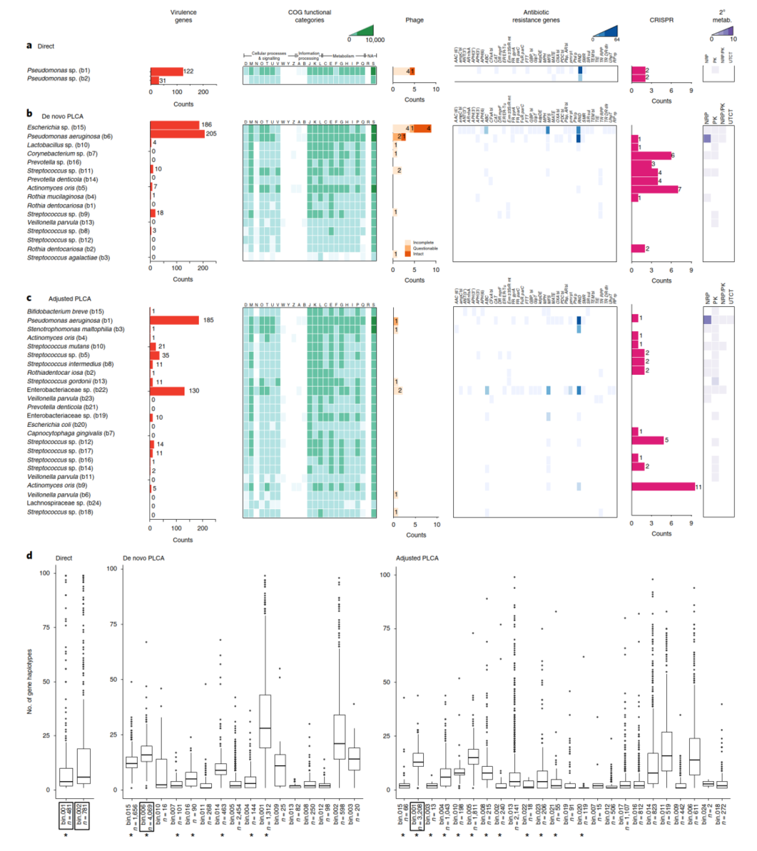 通過(guò)富集培養(yǎng)獲得的分類(lèi)學(xué)多樣性的增加直接轉(zhuǎn)化為該微生物群落功能信息的增加(圖6)。富集培養(yǎng)測(cè)序在直系同源蛋白簇(COGs)、毒力基因、抗生素抗性基因、CRISPRs和次級(jí)代謝功能方面獲得更大的多樣性和功能鑒定數(shù)量。先前的研究已經(jīng)證實(shí)囊性纖維化氣道以及整個(gè)人類(lèi)微生物群中存在單一物種的異質(zhì)性群體。作者通過(guò)鑒定基因單倍型來(lái)計(jì)算每個(gè)宏基因組bin的遺傳變異性(圖6d)。在一些宏基因組bins中,作者鑒定到一個(gè)一致的和少量的基因單倍型,表示這個(gè)bin代表一個(gè)單一的基因組群體(即一個(gè)菌株)。在大多數(shù)bins中,作者觀察到大量的單倍型多樣性,指示異質(zhì)性群體,即多菌株。不出所料,這些區(qū)域中每個(gè)基因的單倍型數(shù)量是多種多樣的,這表明細(xì)菌基因組內(nèi)進(jìn)化壓力的已知范圍。平均而言,假單胞菌屬種中鑒定出更多的基因單倍型,富集培養(yǎng)的bins比直接測(cè)序更多。然而,直接測(cè)序鑒定了大量的普遍存在的單倍型基因離群值。Bin的完整性與平均單倍型頻率沒(méi)有相關(guān)性。