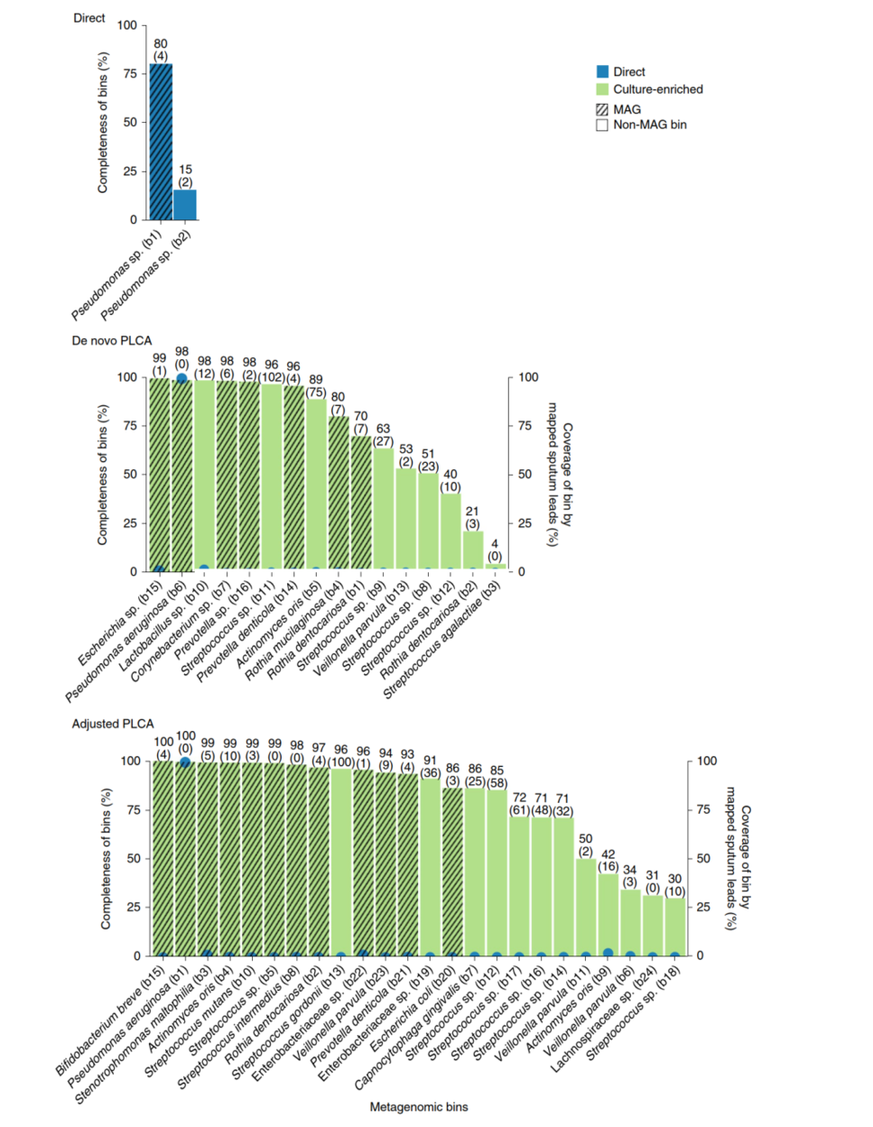 作者將擴(kuò)增子測(cè)序與富集培養(yǎng)宏基因組測(cè)序相結(jié)合研究人類(lèi)微生物群落。以肺囊性纖維化為例,平均培養(yǎng)了82.13%的可操作分類(lèi)單元(OTUs),占痰液樣本直接測(cè)序所鑒定的相對(duì)豐度的99.3%,更重要的是,與直接測(cè)序相比,富集培養(yǎng)方法鑒定的OTUs多了63.3%。作者開(kāi)發(fā)了平板覆蓋算法(PLCA),以確定富集培養(yǎng)平板的代表性子集,從而在該子集上進(jìn)行宏基因組研究。與不依賴培養(yǎng)的方法相比,可以恢復(fù)更多的物種多樣性(包含更好的低豐度物種的組裝基因組,MAGs),更長(zhǎng)的重疊群和更好的功能注釋結(jié)果。PLCA算法也可以應(yīng)用于此前發(fā)布的腸道菌群數(shù)據(jù)集,富集培養(yǎng)分子圖譜可以更好的了解微生物菌群在人類(lèi)健康和疾病中的作用。