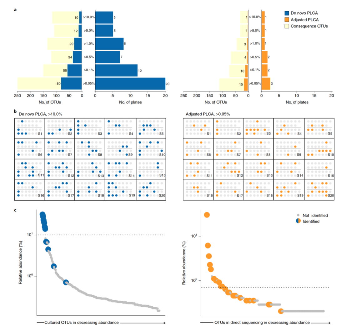 作者采用了PLCA算法,來(lái)決定需要進(jìn)行富集培養(yǎng)宏基因組測(cè)序的最小樣品數(shù),算法對(duì)任何含有大部分可培養(yǎng)富集的菌群生態(tài)均適用。PLCA算法有兩個(gè)版本,從頭 PLCA不依賴于直接測(cè)序結(jié)果再現(xiàn)富集培養(yǎng)菌群,而校正PLCA側(cè)重于直接測(cè)序結(jié)果中OTU的修復(fù),這取決于是否都對(duì)原始樣品的菌群組成感興趣。采用這兩種算法,數(shù)據(jù)集凸顯了不同樣本的獨(dú)特性:從頭PLCA顯示,每個(gè)樣本具有獨(dú)特的平板集,并且每個(gè)培養(yǎng)條件對(duì)每個(gè)樣本都是必要的;校正PLCA顯示對(duì)數(shù)據(jù)集中樣本進(jìn)行富集培養(yǎng)宏基因組測(cè)序是很有必要的(圖4a,b)。