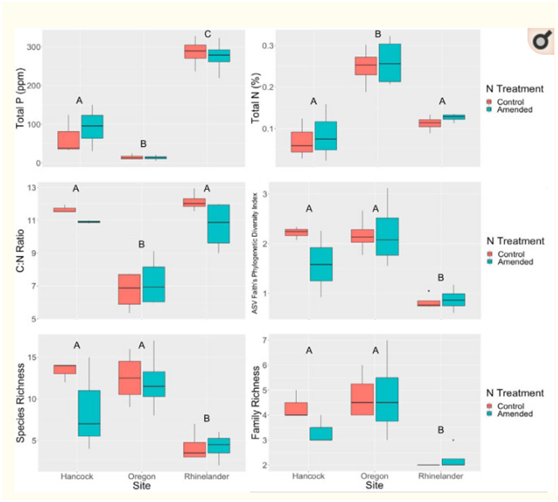 全磷、全氮、C:N比值、AMF的系統(tǒng)發(fā)育指數(shù)、物種豐富度和科水平物種豐富度在不同地點均有顯著差異。置換方差分析(PERMANOVA)結果表明,N處理對ASV?的UniFrac群落差異無顯著影響;而群落的不相似性與土壤全氮的含量顯著相關。