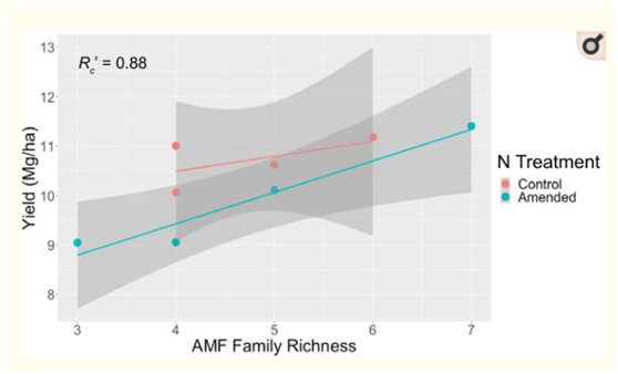 在包括施氮處理在內(nèi)的線性混合效應回歸模型中,AMF的?ASV多樣性指標不能顯著預測任何地點的柳枝稷產(chǎn)量。在科水平上,AMF豐富度是俄勒岡地塊產(chǎn)量的邊際顯著預測因子;俄勒岡地區(qū)AMF群落中科水平的豐富度越高,柳枝稷產(chǎn)量就越高,表明隨著AMF家族的豐富,柳枝稷可能由于AMF功能互補而受益于更大的多樣性。
