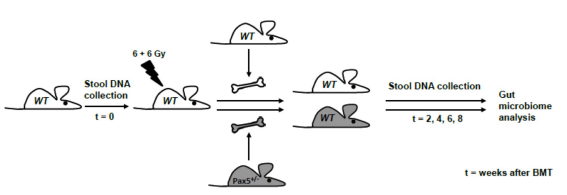 為了研究腸道微生物群在Pax5+/-小鼠PB-ALL發(fā)育中的作用,我們建立了一個(gè)由24只對(duì)照仔鼠野生型(WT)和24只Pax5+/-雌性小鼠組成的小鼠隊(duì)列。每籠飼養(yǎng)6只小鼠,分別飼養(yǎng)在混合基因型籠子(每個(gè)基因型3只,籠子1-4)或相同基因型籠子(同一基因型6只小鼠,籠子5-8)中(圖1A)。
